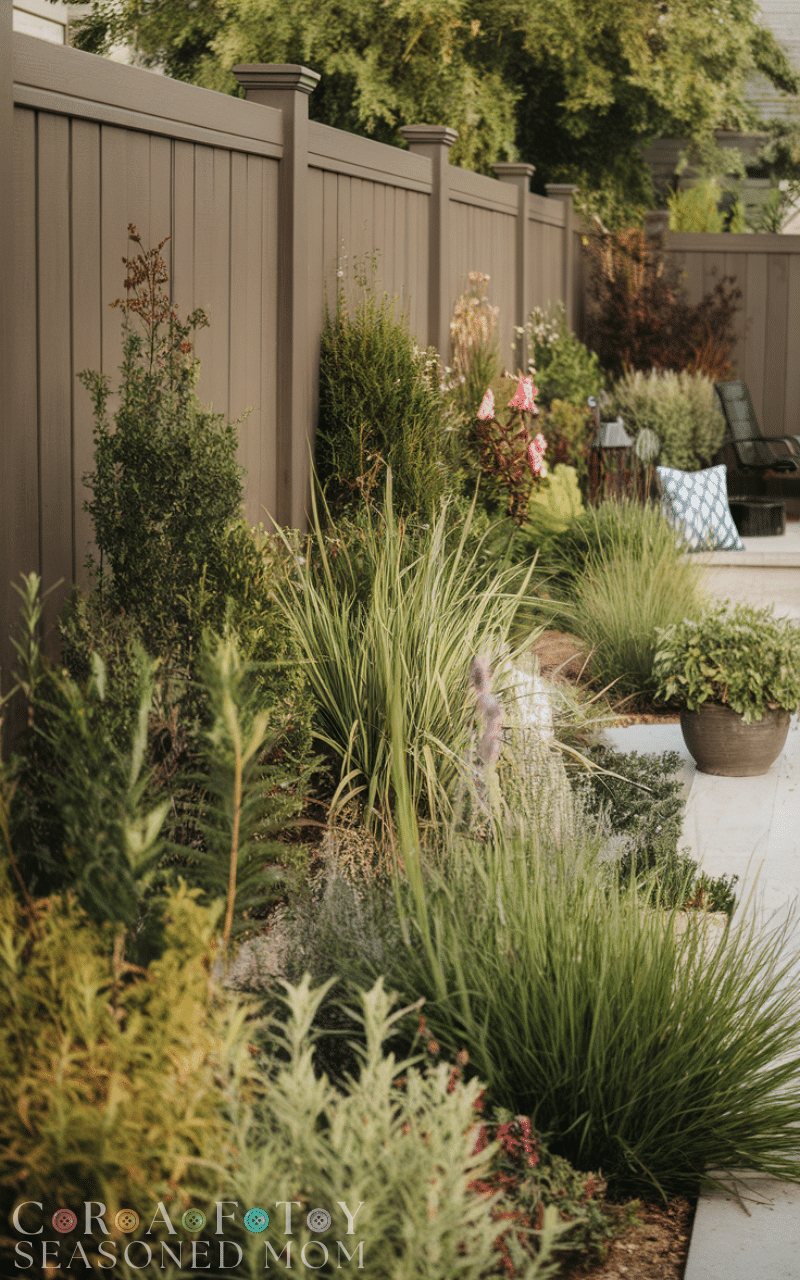 Pairing a solid fence with plants creates the best balance. This backyard privacy fence idea uses shrubs, flowers, or grasses along the fence line to soften the look, boost privacy, and enhance curb appeal from every angle.