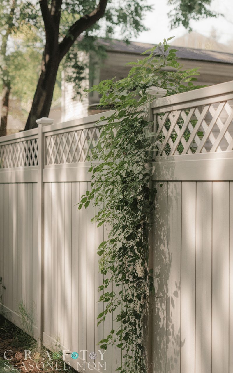Adding lattice at the top softens a tall fence. This backyard privacy fence idea creates separation while allowing light through and offering support for climbing plants, making the fence feel decorative rather than heavy.