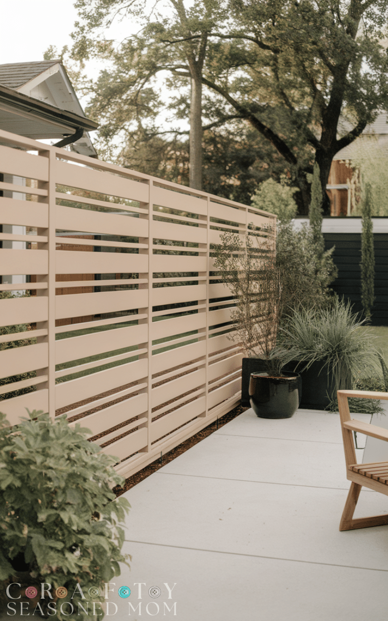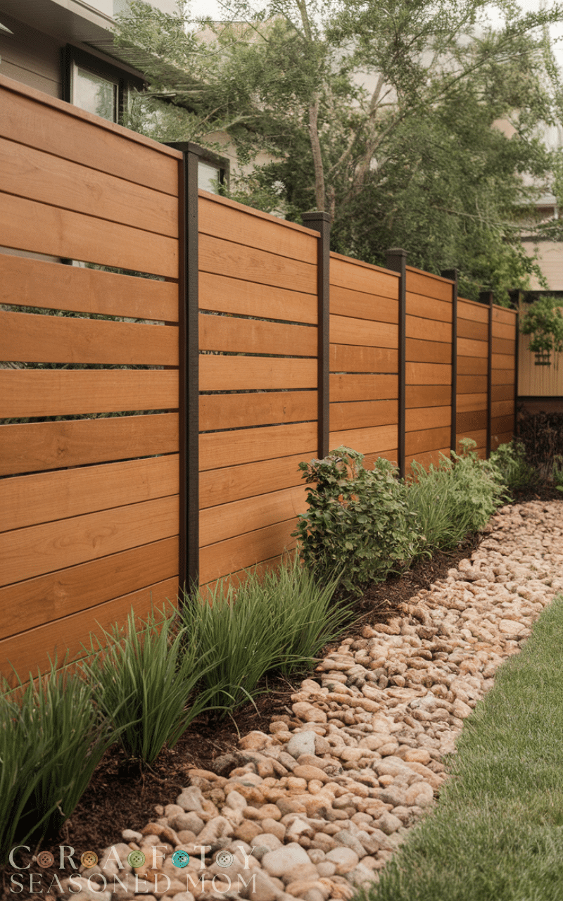 Horizontal slats give a modern, clean look. This backyard privacy fence idea makes your yard feel wider and more contemporary while still blocking unwanted views. Adjusting the spacing allows light and airflow without sacrificing privacy.