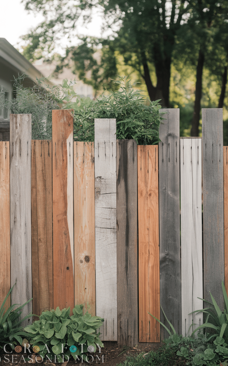 Reclaimed wood adds charm and sustainability. This backyard privacy fence idea offers full privacy while bringing character and texture to your outdoor space, making the fence feel unique and personal.