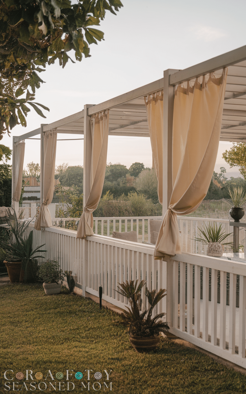 Outdoor curtains soften hard fence lines. This backyard privacy fence idea adds flexibility, allowing you to open or close panels as needed while creating a cozy, resort-style atmosphere.