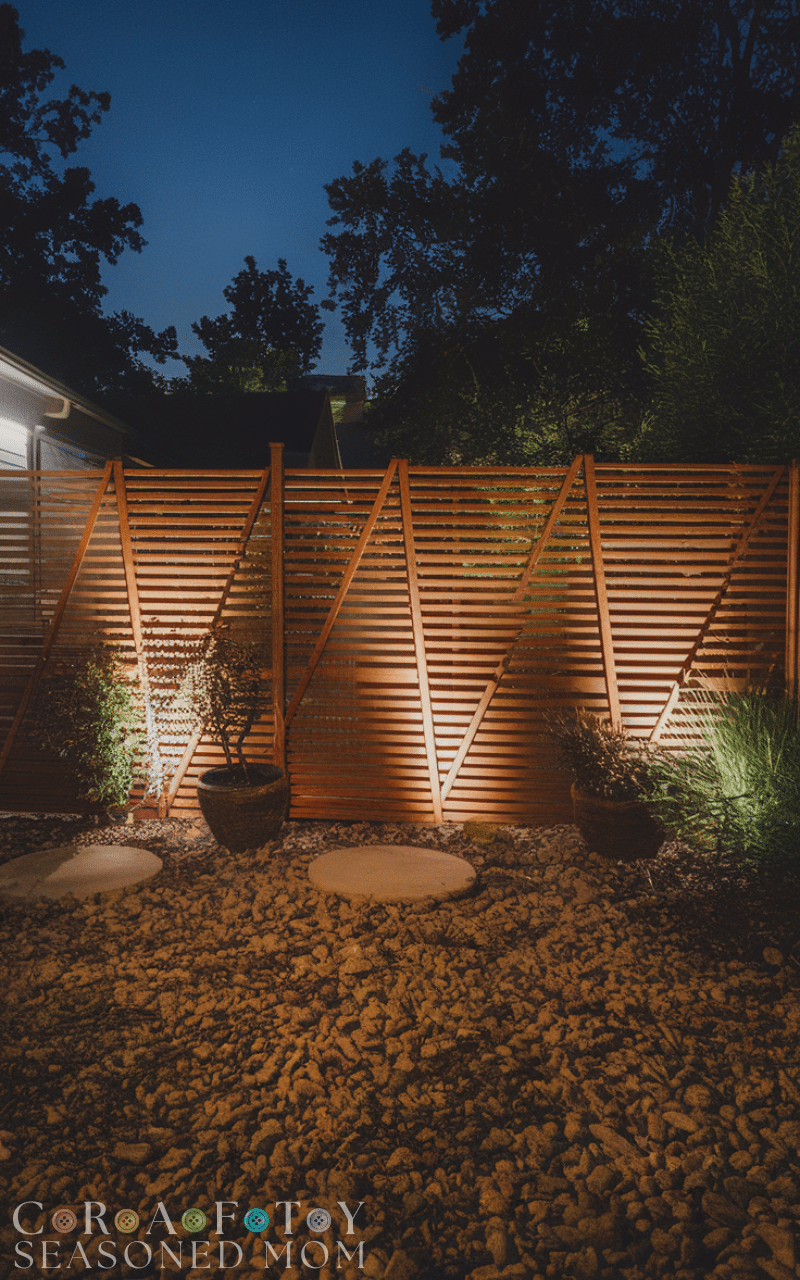 Adding lighting enhances both safety and ambiance. This backyard privacy fence idea highlights the fence design at night and makes your backyard feel warm, secure, and inviting after dark.