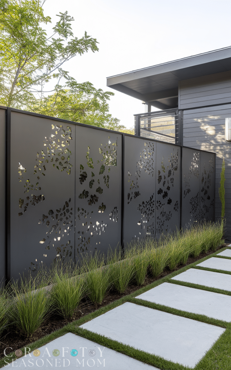 Metal panels with cut-out designs provide privacy and style. This backyard privacy fence idea allows airflow and light while creating a striking focal point, especially in modern or contemporary yards.