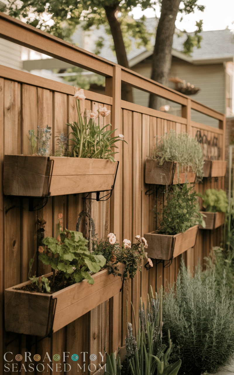 Planters attached to the fence add color and interest. This backyard privacy fence idea combines privacy with garden style, allowing flowers or herbs to enhance the look while keeping the space cozy and enclosed.