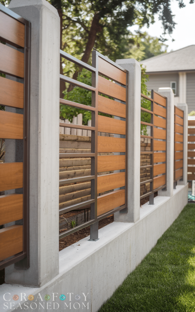 Combining wood with metal or concrete adds character. This backyard privacy fence idea creates a custom, high-end look while maintaining privacy. Mixing materials also helps match modern or industrial outdoor designs.