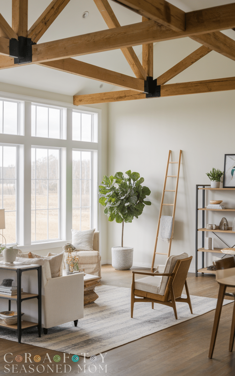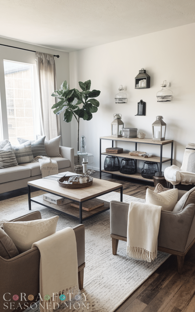 Decorate with farmhouse-inspired accessories like mason jars, lanterns, metal trays, and soft throws to complete your modern rustic farmhouse living room. These simple, budget-friendly touches make your space feel warm, inviting, and authentically rustic while maintaining a modern aesthetic.