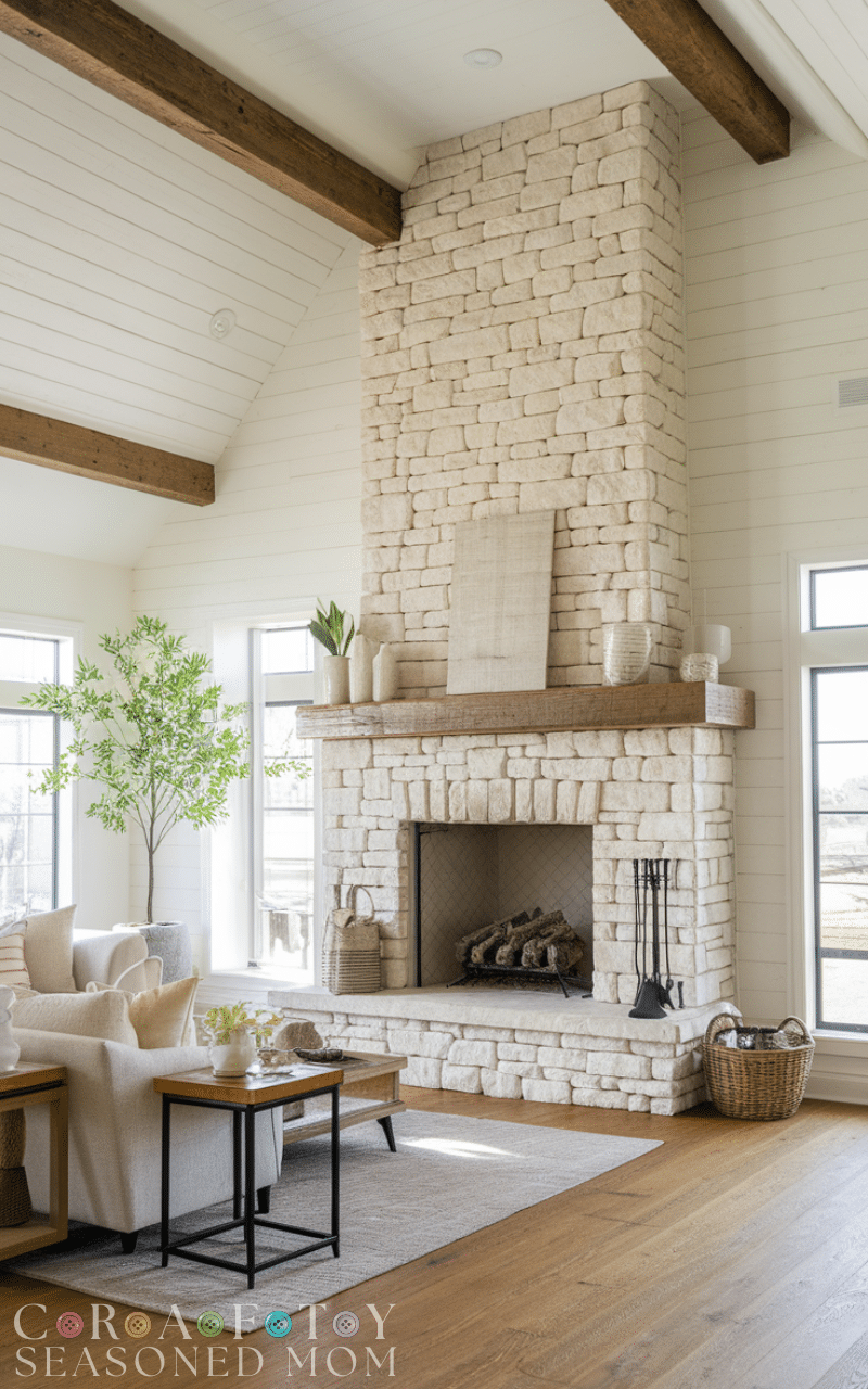 A statement fireplace serves as the perfect focal point in a modern rustic farmhouse living room. Use stone, brick, or shiplap for a rustic touch. Decorating the mantel with seasonal accents or simple candles complements the modern rustic farmhouse living room style beautifully.
