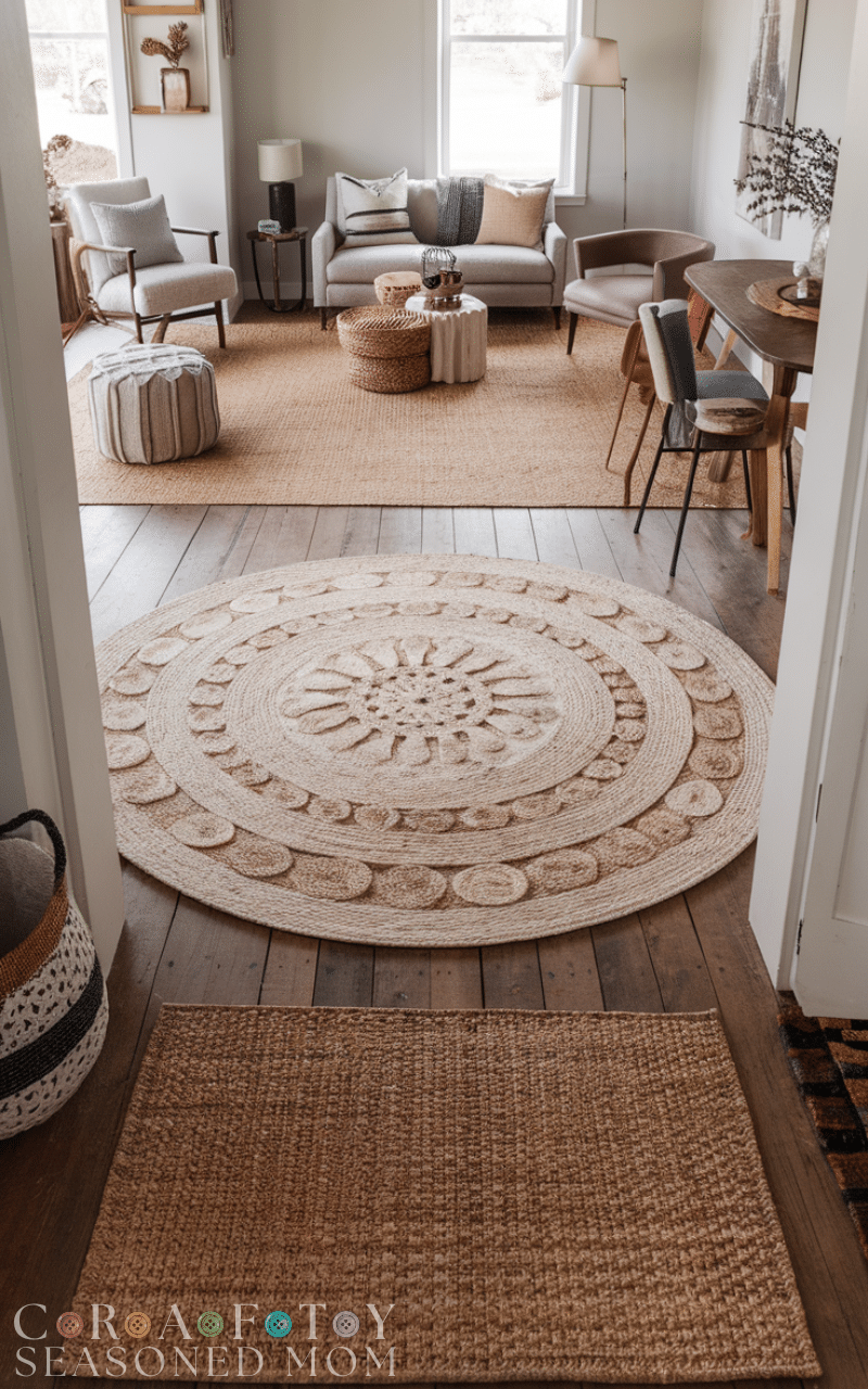 Layering rugs is an easy trick that adds softness and personality. Try placing a patterned rug over a neutral base layer such as jute or wool. This approach makes the seating area feel cozy while visually defining the space.