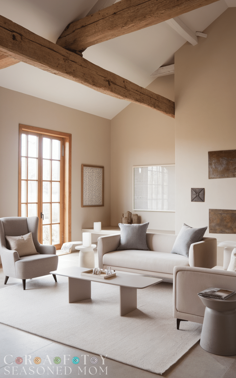 A calm base of warm whites, gentle grays, and soft beige tones helps create a welcoming atmosphere. These shades allow wood textures, woven materials, and layered accents to stand out without overwhelming the space. Adding earthy pillows or subtle patterned rugs keeps the room from feeling flat while maintaining warmth.