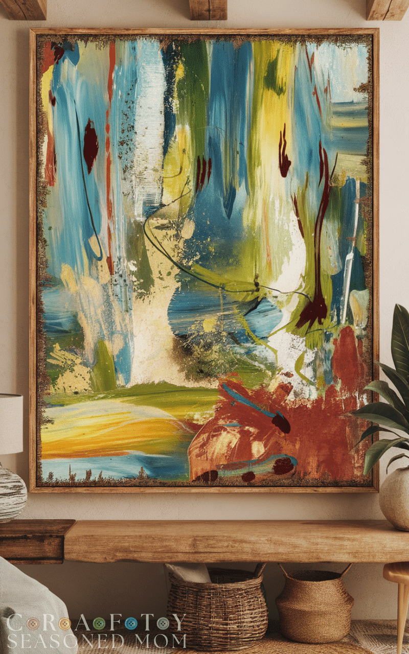 Modern Rustic Farmhouse Living Room living on a 40-acre property means my Farmhouse Living Room is the heart of a busy farm, but it started to feel more drab than dreamy. Even with beautiful pieces like my grandma’s antique dresser, the space leaned too heavily on safe browns, creams, and dark navy that didn’t match my personality, and my old wall art had faded into the background over time. I already shared Flower Pot Painting Ideas to add small touches of life, but what my living room truly needed was a colorful boho-eclectic refresh strong enough to handle a toddler, two dogs, and everyday farm life.