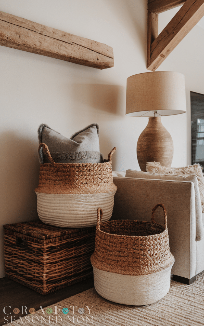 Woven baskets are both decorative and practical in a modern rustic farmhouse living room. Use them to store blankets, magazines, or toys. Their natural textures blend seamlessly with rustic wood and neutral tones, enhancing the overall aesthetic of your modern rustic farmhouse living room.