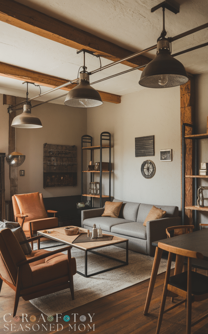 Industrial-style lighting with metal finishes and simple designs pairs perfectly with rustic wood elements in a modern rustic farmhouse living room. Pendant lights or floor lamps add warmth and functionality. This lighting style enhances your modern rustic farmhouse living room’s cozy yet modern atmosphere.
