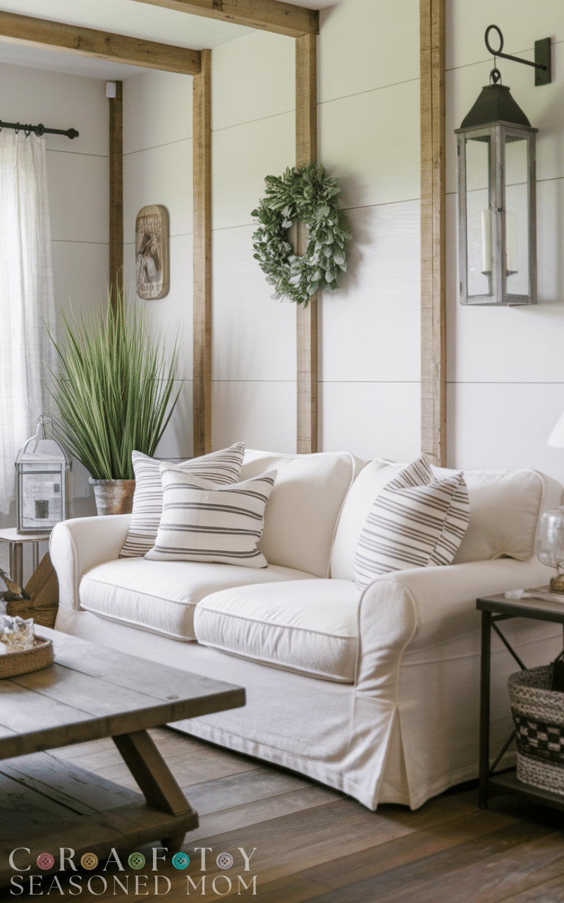 Slipcovered sofas offer both comfort and versatility for a modern rustic farmhouse living room. Neutral-colored fabrics fit the rustic aesthetic while allowing for easy cleaning and seasonal changes. This choice keeps your modern rustic farmhouse living room casual, cozy, and family-friendly.