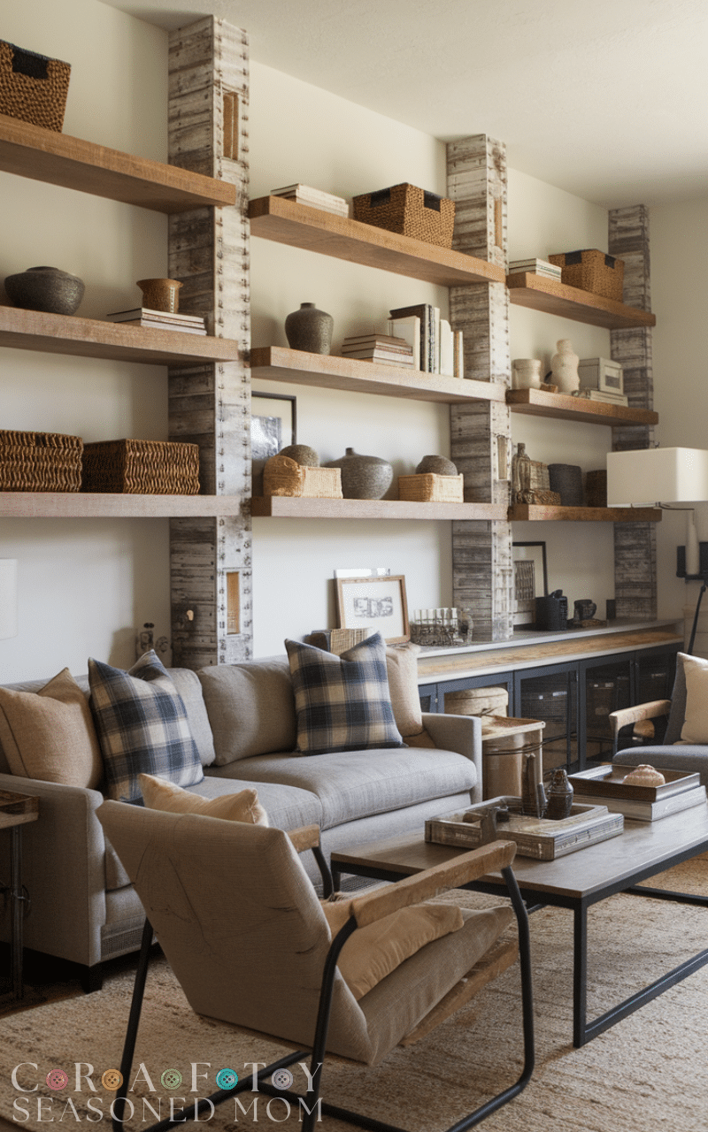 Open shelving with reclaimed wood or distressed finishes adds storage and style to your modern rustic farmhouse living room. Display books, pottery, or woven baskets to enhance the rustic vibe. These shelves make your modern rustic farmhouse living room functional while showcasing curated decor.
