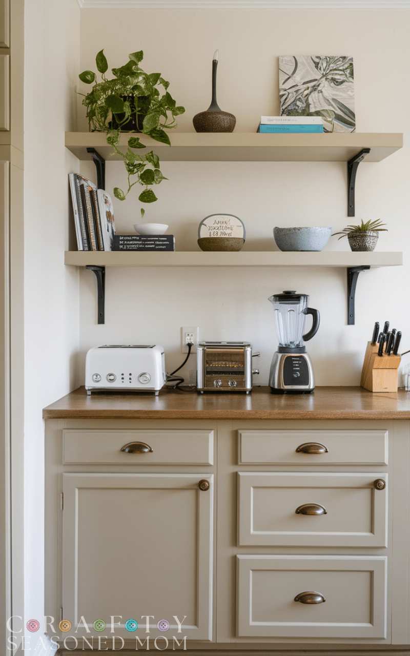 Open shelving is a simple way to make a kitchen feel brighter and more open. Instead of hiding everything behind closed doors, shelves allow you to display your favorite dishes, glasses, and decorative items. This approach makes everyday essentials easier to reach while also adding personality to the room.