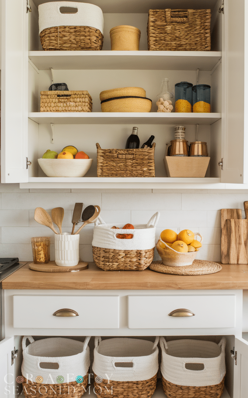 Incorporating baskets into your kitchen cabinet decor is a practical and stylish way to organize everything and it adds texture and warmth to the space because woven baskets can hold fruits snacks or utensils while keeping the cabinets tidy and attractive and they are easy to move around which makes accessing items simpler and mixing different basket sizes and materials creates a charming look which enhances your kitchen cabinet decor naturally and creatively.