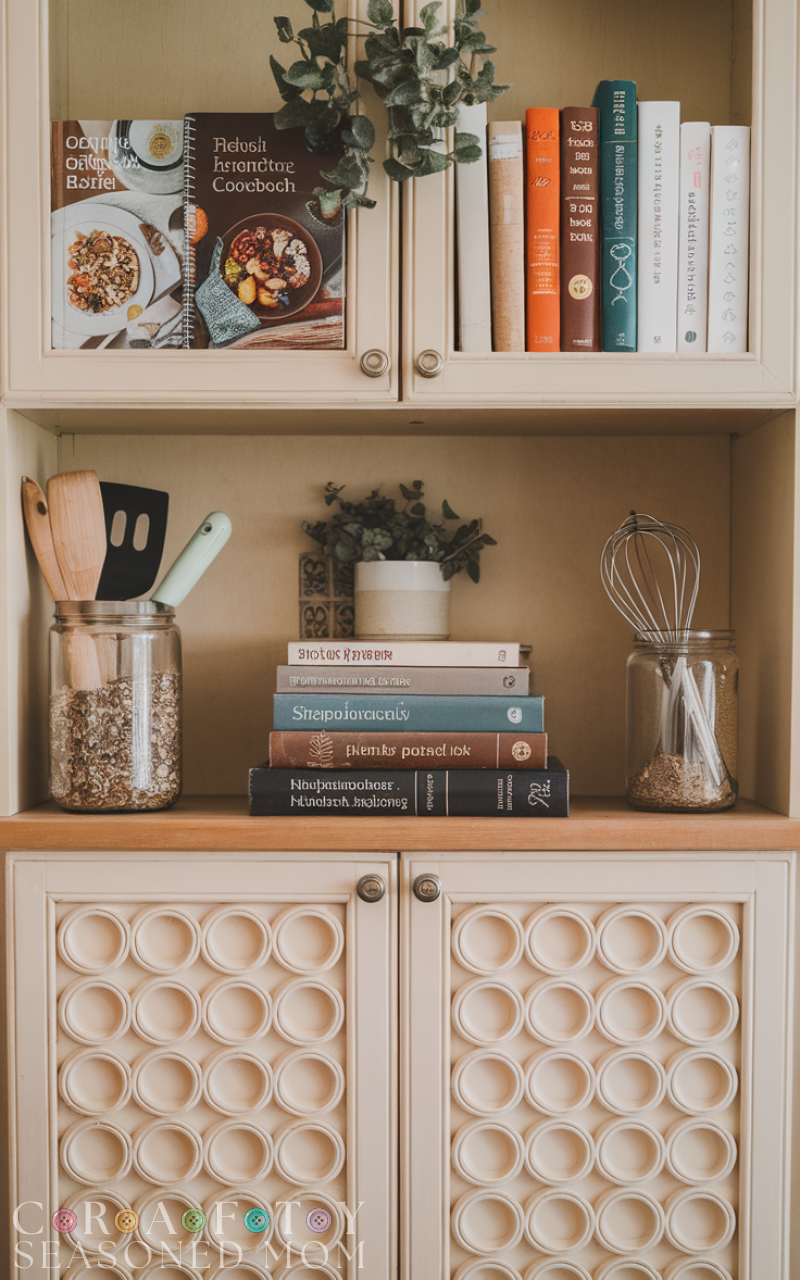Incorporating cookbooks and kitchen accessories into your kitchen cabinet decor adds warmth and personality because it turns functional items into stylish displays and arranging them by color or theme creates harmony while making the space feel lived-in and including small plants or decorative jars alongside books adds dimension which makes your kitchen cabinet decor both practical and visually interesting.