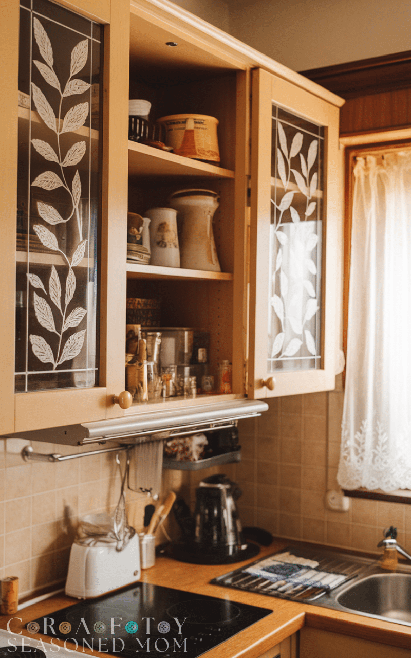 Glass inserts with patterns transform your kitchen cabinet decor by combining transparency with artistic design because etched or frosted glass adds character while still allowing you to see the contents inside and it works well with both modern and traditional kitchens and mixing clear and patterned glass creates contrast and texture which makes your kitchen cabinet decor unique and stylish while showing off your personality.