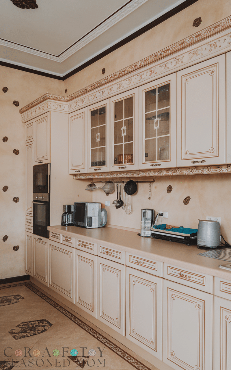 Adding decorative molding to your cabinets enhances your kitchen cabinet decor because it brings architectural detail and sophistication to even the simplest cabinets and you can choose crown molding or beadboard to match your style and it adds depth and elegance while elevating the overall aesthetic of your kitchen and pairing molding with complementary cabinet colors emphasizes the design which makes your kitchen cabinet decor timeless and elegant.