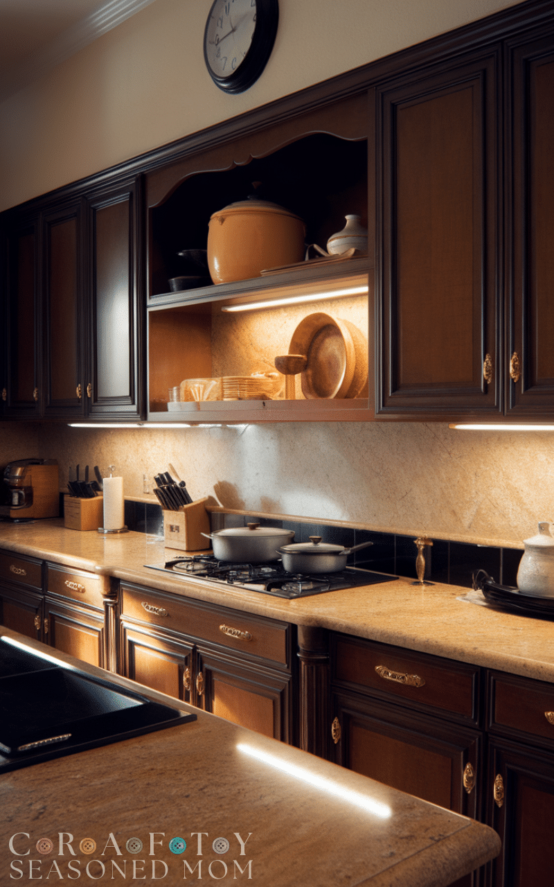 Adding under-cabinet lighting improves your kitchen cabinet decor by making your countertops more functional and adding a cozy ambiance and it highlights your cabinet details while making cooking and meal prep easier and LED strips or puck lights are perfect for creating a warm inviting glow which makes your kitchen cabinet decor feel professional and elegant and this lighting choice is subtle yet impactful for enhancing your kitchen’s overall look.