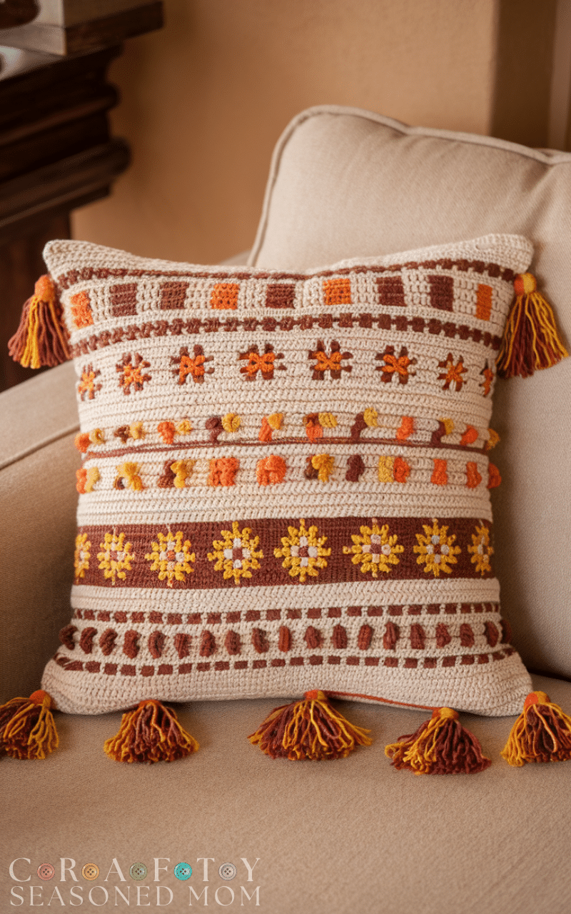 Boho lovers will adore this option from the 15 ideas for crochet pillows list. Adding fringe or tassels around the edges gives the pillow movement and personality. This style pairs beautifully with earthy tones, natural fibers, and relaxed interiors. The crochet base can be simple, letting the fringe do all the talking. It’s a perfect way to bring a relaxed, artistic vibe into your living space without making the project too complicated.