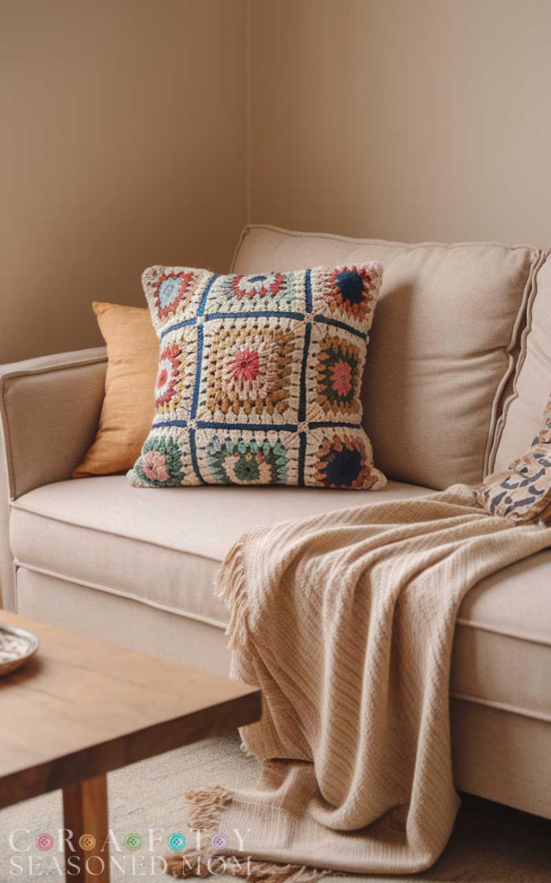 For contemporary homes, this is one of the most stylish 15 ideas for crochet pillows. Geometric shapes and clean lines give a modern, polished feel. Using contrasting colors helps the design stand out while still looking elegant. This crochet pillow works well in minimalist spaces where you want a handmade touch without overwhelming the décor. It’s a great balance between creativity and simplicity.