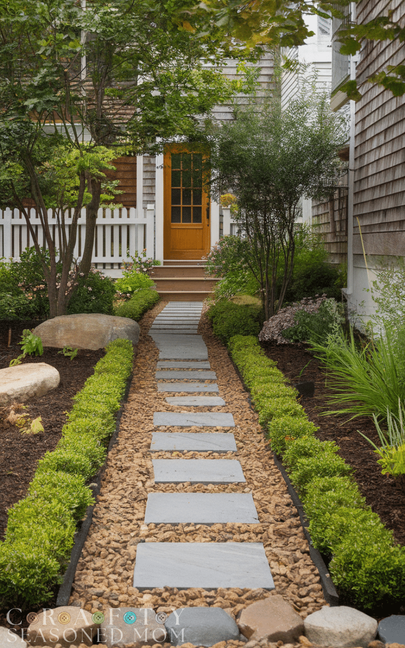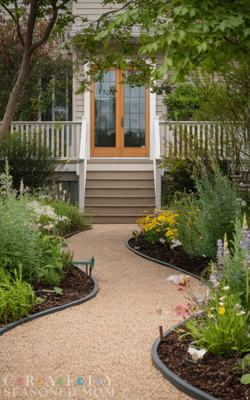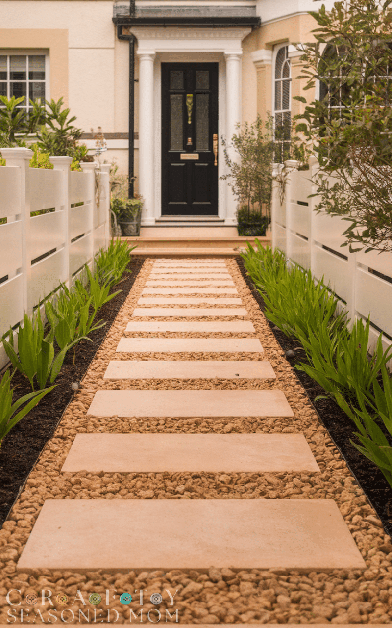Highlighting a pathway is one of the most practical gravel front garden ideas. A gravel path guides visitors naturally to your front door. It adds structure while keeping the design light and airy. Borders with plants or stones help define the path. This idea improves curb appeal while remaining simple and functional.