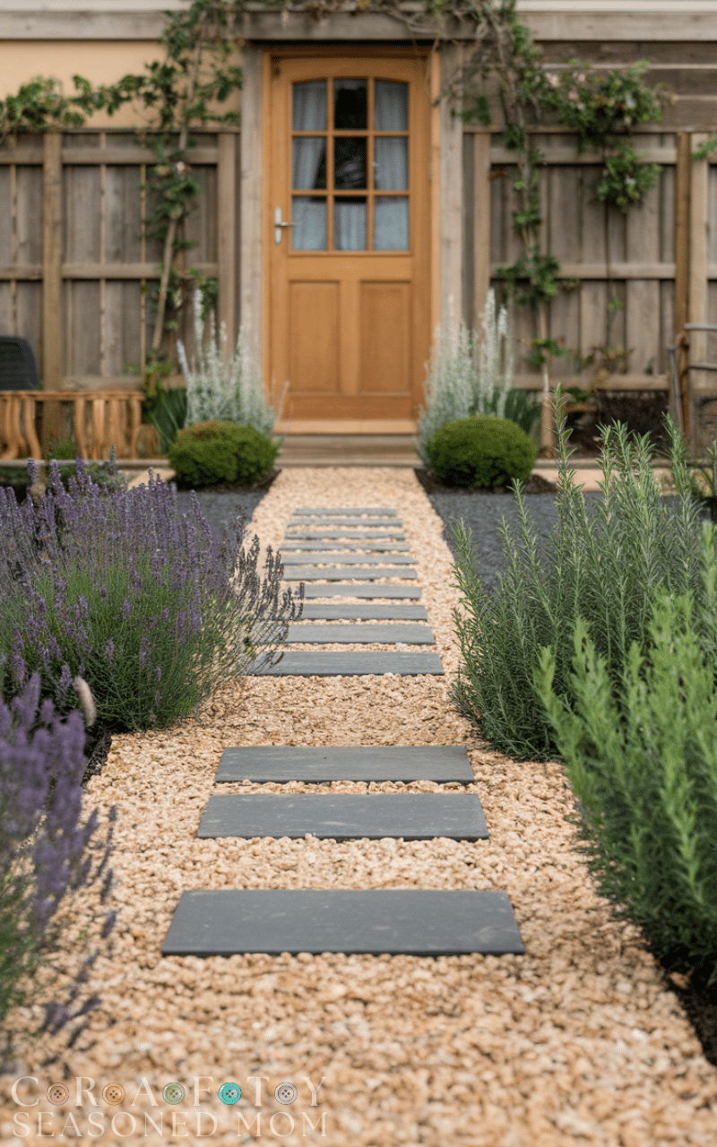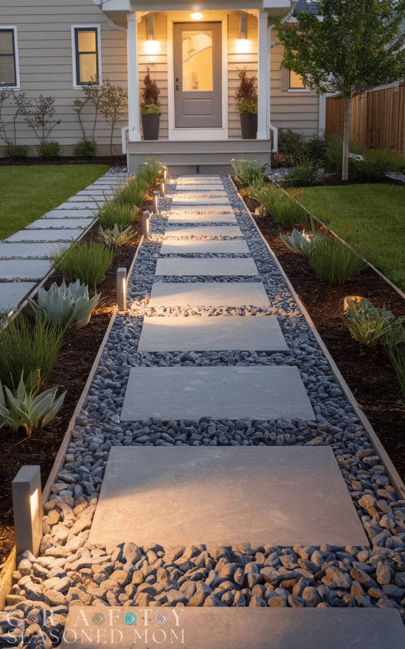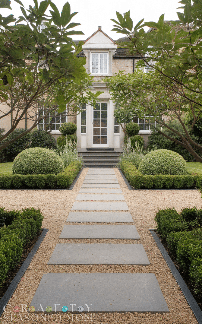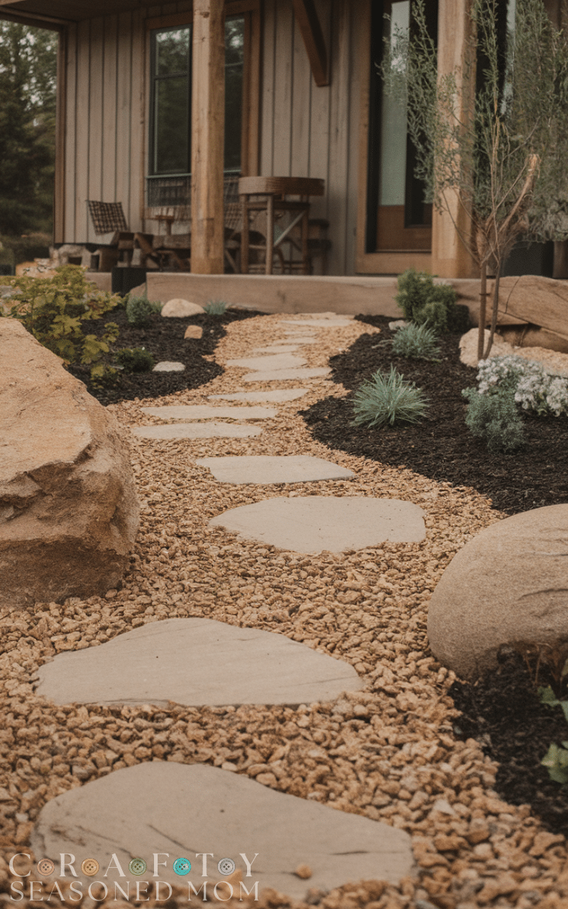 Highlighting a pathway is one of the most practical gravel front garden ideas. A gravel path guides visitors naturally to your front door. It adds structure while keeping the design light and airy. Borders with plants or stones help define the path. This idea improves curb appeal while remaining simple and functional.