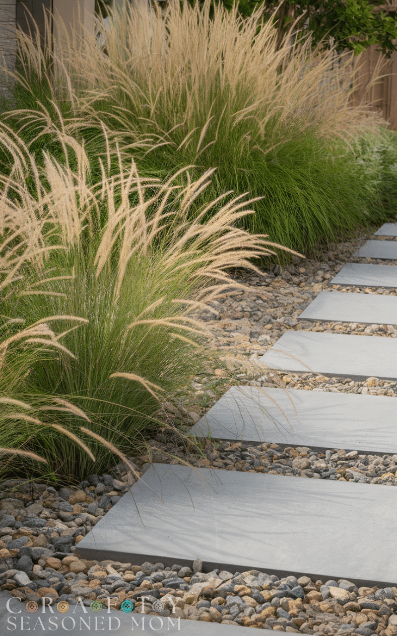Ornamental grasses add movement and softness to gravel front garden ideas. Their natural flow contrasts beautifully with the stillness of gravel. This pairing creates a relaxed and modern feel. Grasses are low-maintenance and thrive in well-drained gravel gardens. Together, they form a stylish front garden that feels lively without being overwhelming.