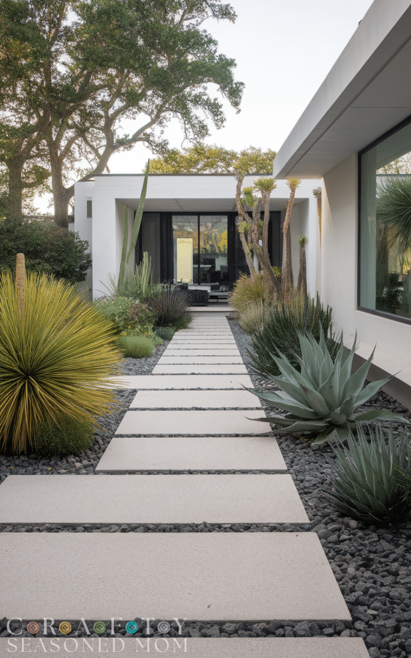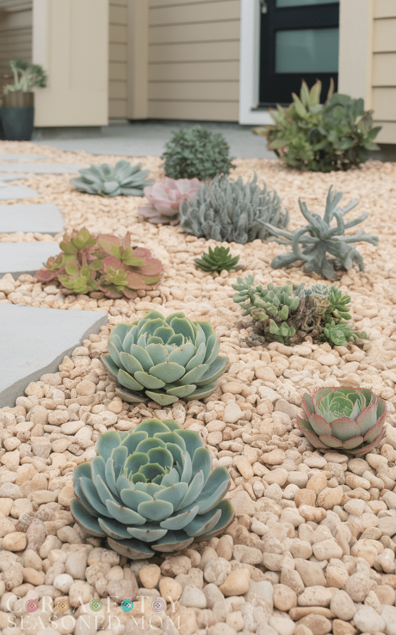Succulents are perfect for gravel front garden ideas in dry or sunny climates. They thrive in well-drained soil and pair beautifully with gravel textures. This design feels modern, fresh, and very low-maintenance. Succulents add interesting shapes and colors without requiring frequent watering, making them ideal for busy homeowners.
