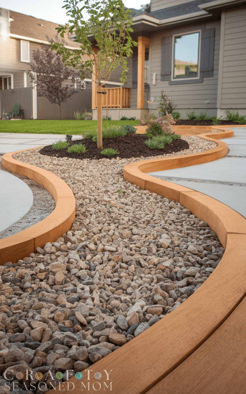 Curves soften the look of gravel front garden ideas. Instead of straight lines, curved edges create a more natural and inviting feel. This design works well with shrubs and flower beds. Curved gravel areas guide the eye and make the front garden feel larger and more dynamic.