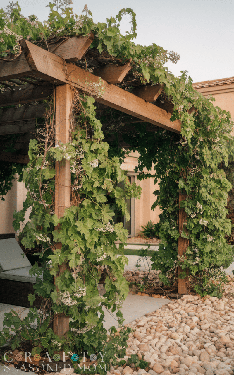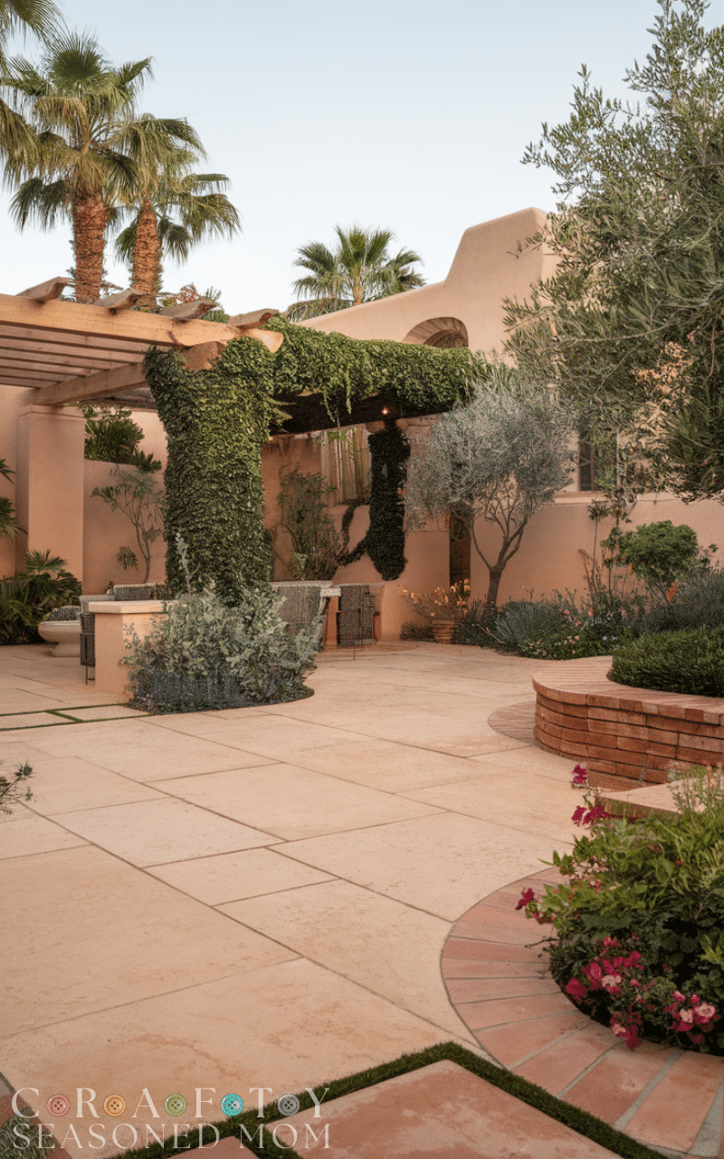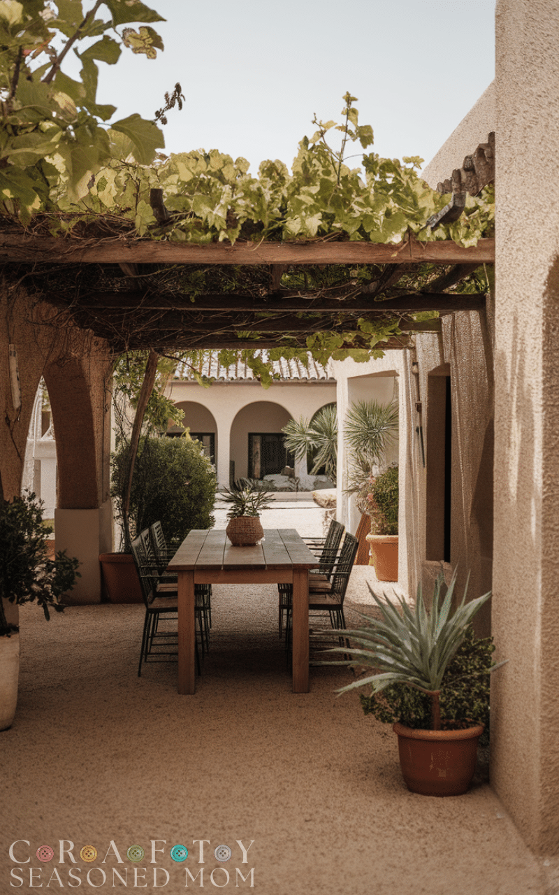 Incorporate a pergola draped with climbing vines to enhance your mediterranean backyard ideas and provide shade and charm at the same time. A wooden or metal pergola entwined with grapevines or bougainvillea will soften the structure and create dappled light beneath which you can relax. This vine-covered shelter invites you to linger outdoors and makes the backyard feel like a calm Mediterranean retreat.