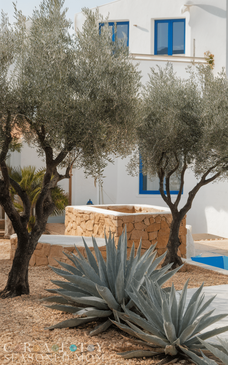 Adding olive trees and plants with silver-green foliage is a standout feature of mediterranean backyard ideas and adds texture and authenticity. Olive trees make great focal points and the silvery leaves of plants like lavender or artemisia reflect sunlight beautifully while evoking Mediterranean landscapes. Plant them around seating areas or in large pots to reinforce the theme.