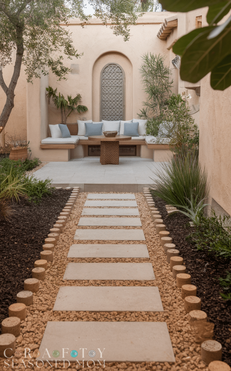 Replace traditional lawn areas in your mediterranean backyard ideas with gravel paths and define courtyard zones for seating or dining. Gravel offers good drainage and a relaxed look that complements Mediterranean style and helps reduce maintenance. Use natural colours like pale beige or light grey and link the zones with stepping stones or low-profile borders which will make the space feel cohesive and intentional.