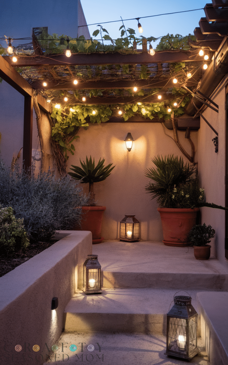 Layering lighting into your design supports your mediterranean backyard ideas by creating a magical atmosphere after dark and extending the usability of your space. Use string lights under the pergola lanterns in the pots and low wall lighting along pathways to highlight texture and plants. Warm-white bulbs and indirect lighting help maintain the relaxed Mediterranean feel and invite you to linger into the night.