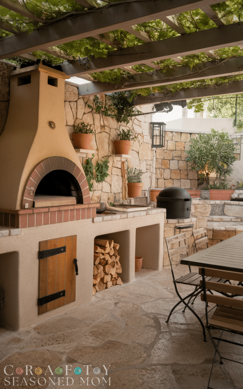 Adding an outdoor kitchen or pizza oven elevates your mediterranean backyard ideas by combining style with practicality and entertainment. A simple built-in grill or traditional stone pizza oven becomes the heart of outdoor gatherings and aligns with the Mediterranean way of living outdoors. Position it near the dining area use warm stone materials and allow for easy flow between cooking and seating so the space is functional and stylish.