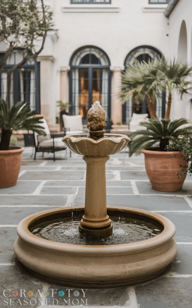 Including a water feature such as a small fountain or reflecting pool elevates your mediterranean backyard ideas and brings refreshing movement and sound to the outdoors. The sound of trickling water adds a peaceful layer and offers relief during warmer days. Whether it’s a simple wall-mounted fountain or a shallow basin you’ll highlight the Mediterranean feel while enhancing the ambience.