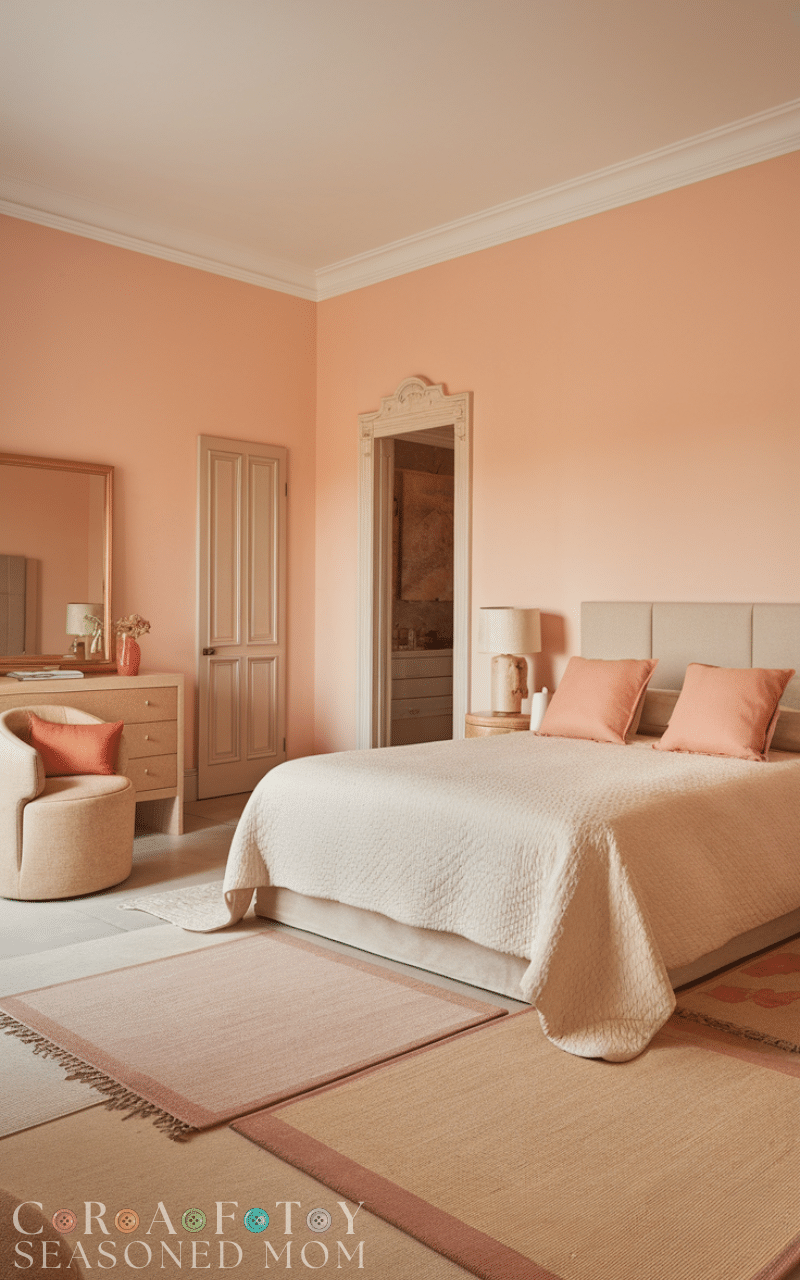 Soft peach is warm, gentle, and inviting, which makes it one of the happiest paint colors for bedrooms. This subtle shade adds a soft glow to the walls and works beautifully with cream, beige, and gold decor. Peach tones create a welcoming atmosphere without feeling too bright or overwhelming. As one of the more unique paint colors for bedrooms, soft peach brings warmth and personality while still maintaining a peaceful vibe.