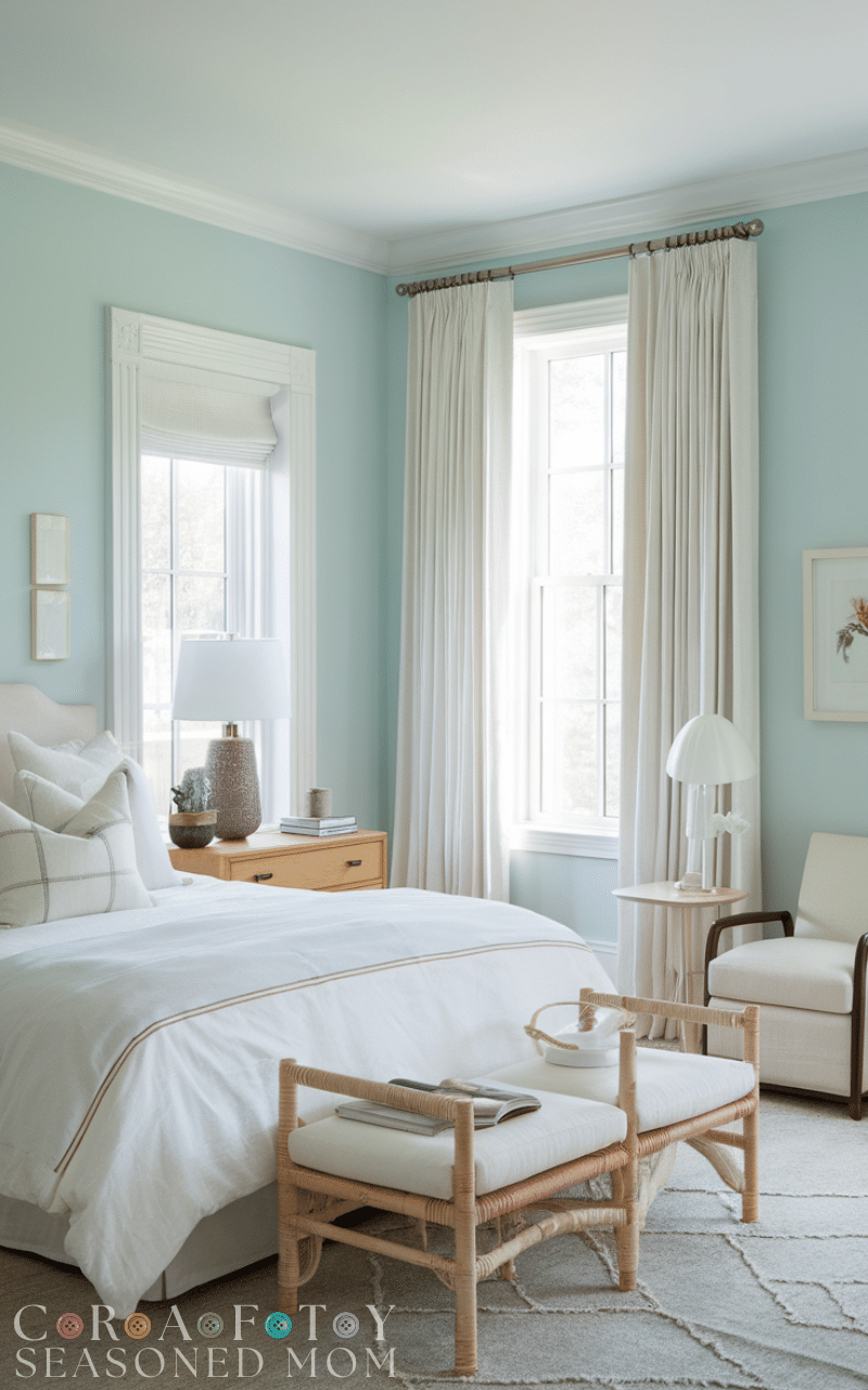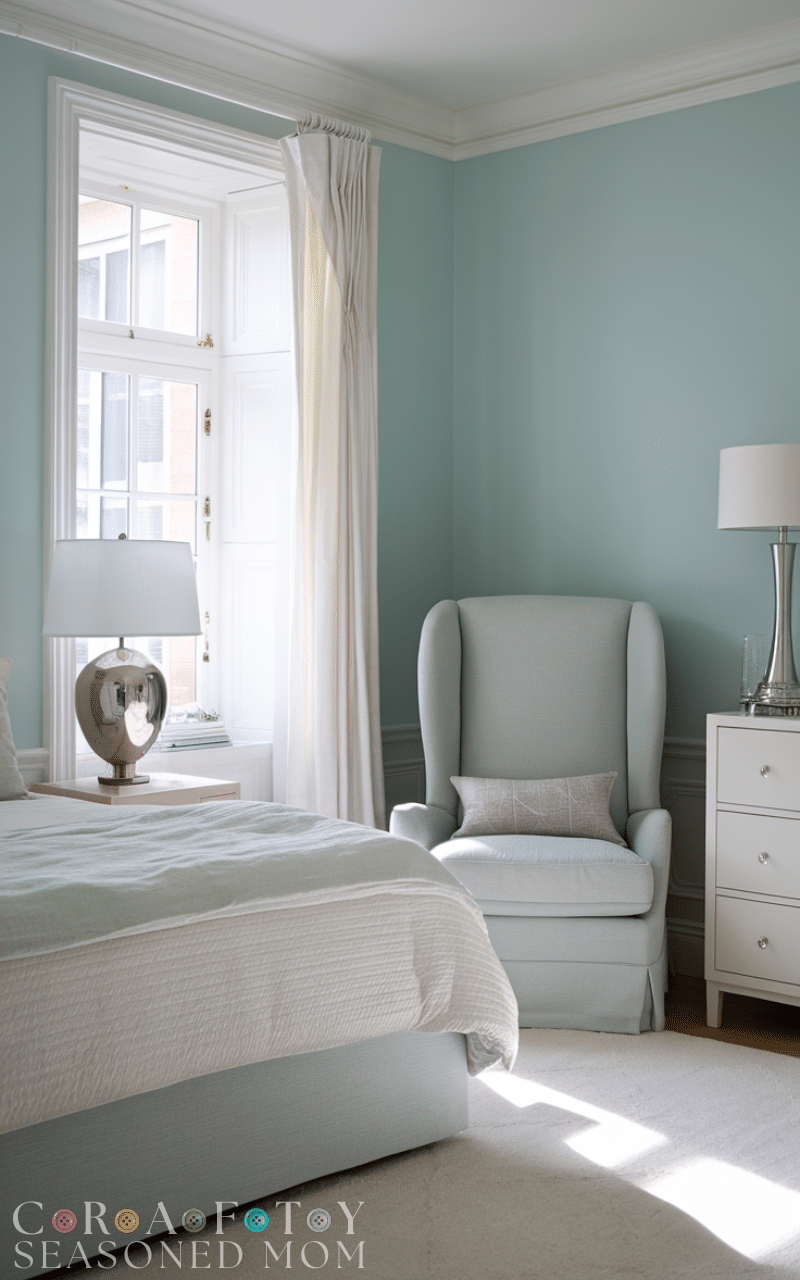 Pale mint is light, fresh, and uplifting, making it one of the most refreshing paint colors for bedrooms. This soft green shade adds personality without overpowering the room. It works well with white furniture and light gray accents for a clean, airy look. Pale mint reflects light gently, which helps brighten smaller bedrooms. As far as cheerful yet calming paint colors for bedrooms go, mint offers a unique balance between color and softness.