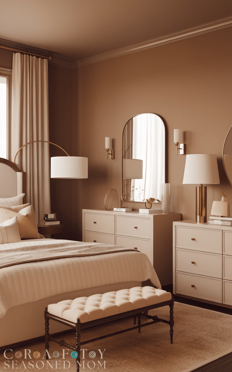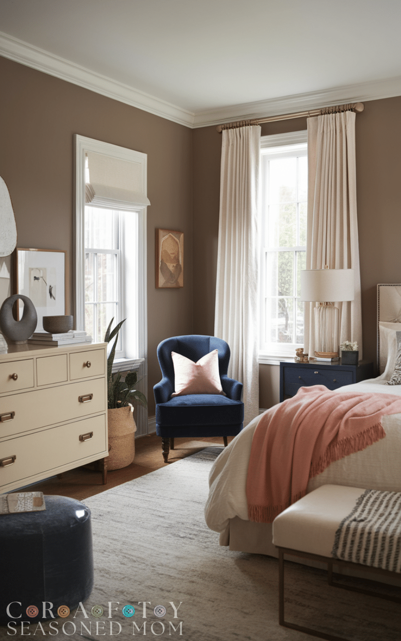 Warm taupe blends gray and brown tones, making it one of the most balanced paint colors for bedrooms. It feels cozy but still modern, offering a refined and neutral look. Taupe pairs easily with cream, navy, or even soft pink accents. This shade adds depth without darkening the room too much. If you want elegant yet comfortable paint colors for bedrooms, warm taupe provides the perfect middle ground.