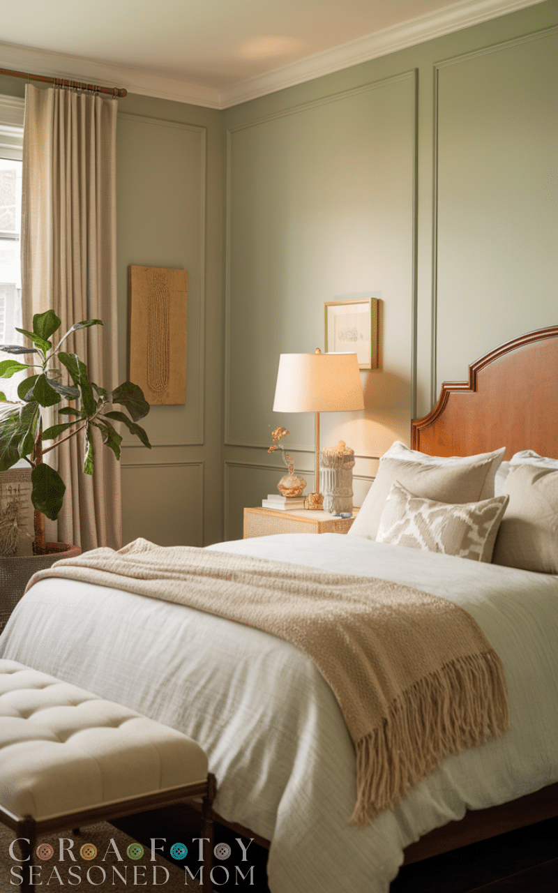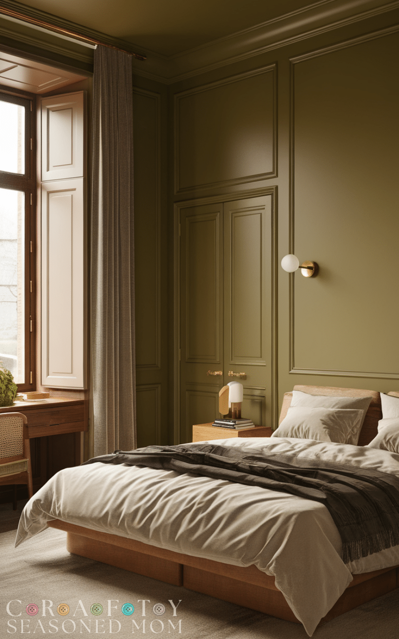 Olive green is rich and natural, making it one of the most grounding paint colors for bedrooms. This deeper green shade creates a cozy and sophisticated atmosphere. It looks stunning with gold fixtures, wooden furniture, and neutral bedding. Olive green brings warmth while still feeling connected to nature. For those who want bold but calming paint colors for bedrooms, olive offers a stylish and mature option.