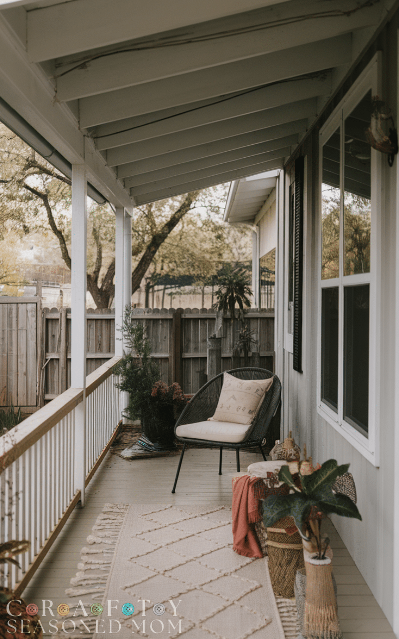 One of my favorite parts was adding a couple of handmade pieces and colorful accents inspired by Modern Boho because the mix of patterns and textures instantly made the porch feel cheerful and warm and even when the chairs did not match perfectly and the rugs wrinkled a little it still looked charming and I realized that the essence of a Small Front Porch is creating a space where you feel happy and at home.