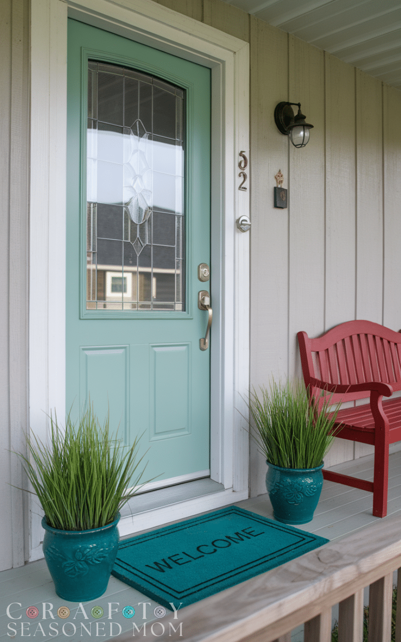 Your door is the centerpiece of your porch so give it some color. Painting it in a bright shade like teal yellow or red can make a big difference and instantly improve your home’s curb appeal. This small front porch idea brings life and personality to your space while keeping things simple. Pair your new door color with a matching welcome mat or flower pots for a balanced and stylish look that makes guests smile every time they visit.