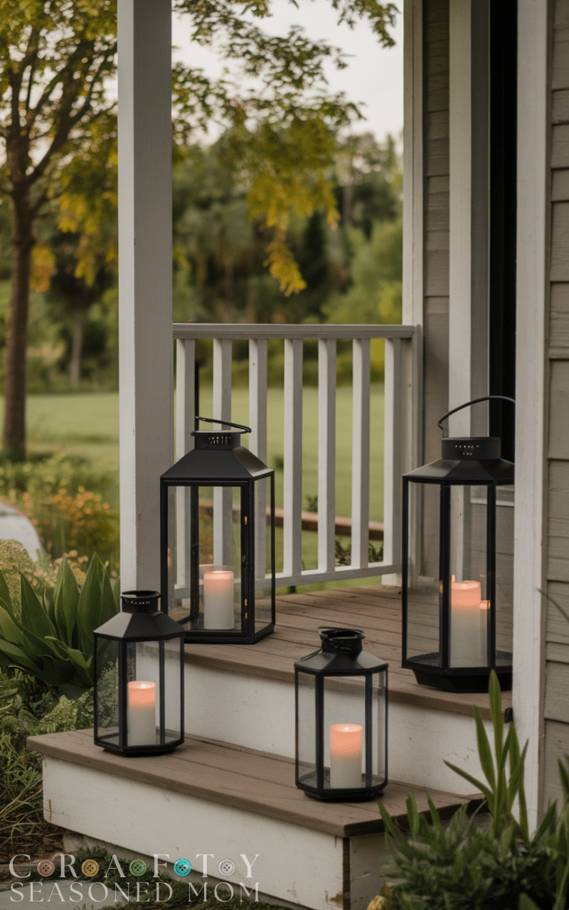 Lanterns bring a timeless beauty to your small front porch. You can place them on steps or hang them near the entrance to create soft and charming light. Combine lanterns of different sizes with LED candles for safety and long-lasting glow. This small front porch idea adds elegance and a peaceful ambiance that makes your evenings delightful and calm. It is also an easy way to make your home feel more inviting all year round.