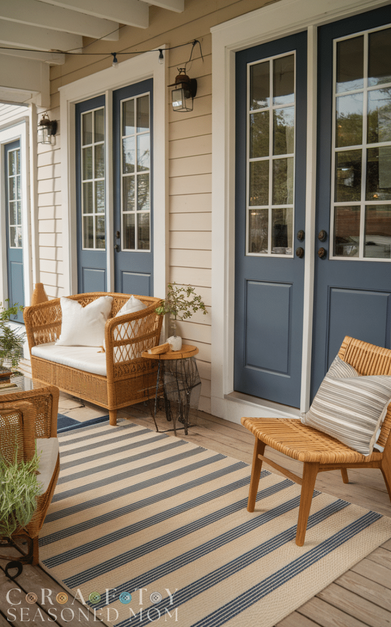 A small rug can do wonders for your front porch decor. Choose a durable outdoor rug that fits the size of your porch and matches your color scheme. This small front porch idea adds texture and warmth underfoot while defining the seating area. A striped or geometric pattern can make the space feel larger and more stylish. With a simple rug your porch becomes a cozy extension of your living space that invites everyone to relax.