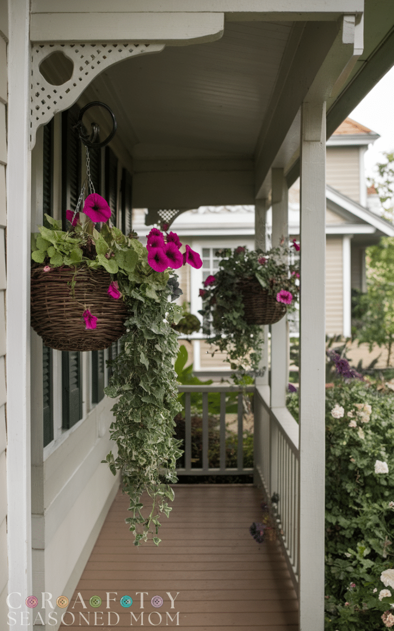 If your space is tight you can go vertical with hanging plants. This small front porch idea is perfect for adding greenery without taking up floor space. Choose hanging baskets with trailing flowers like petunias or ivy for a lush effect. You can hang them from the ceiling or from decorative hooks along the walls. The mix of green leaves and colorful flowers will make your small front porch look lively and full of charm while keeping the area open and uncluttered.