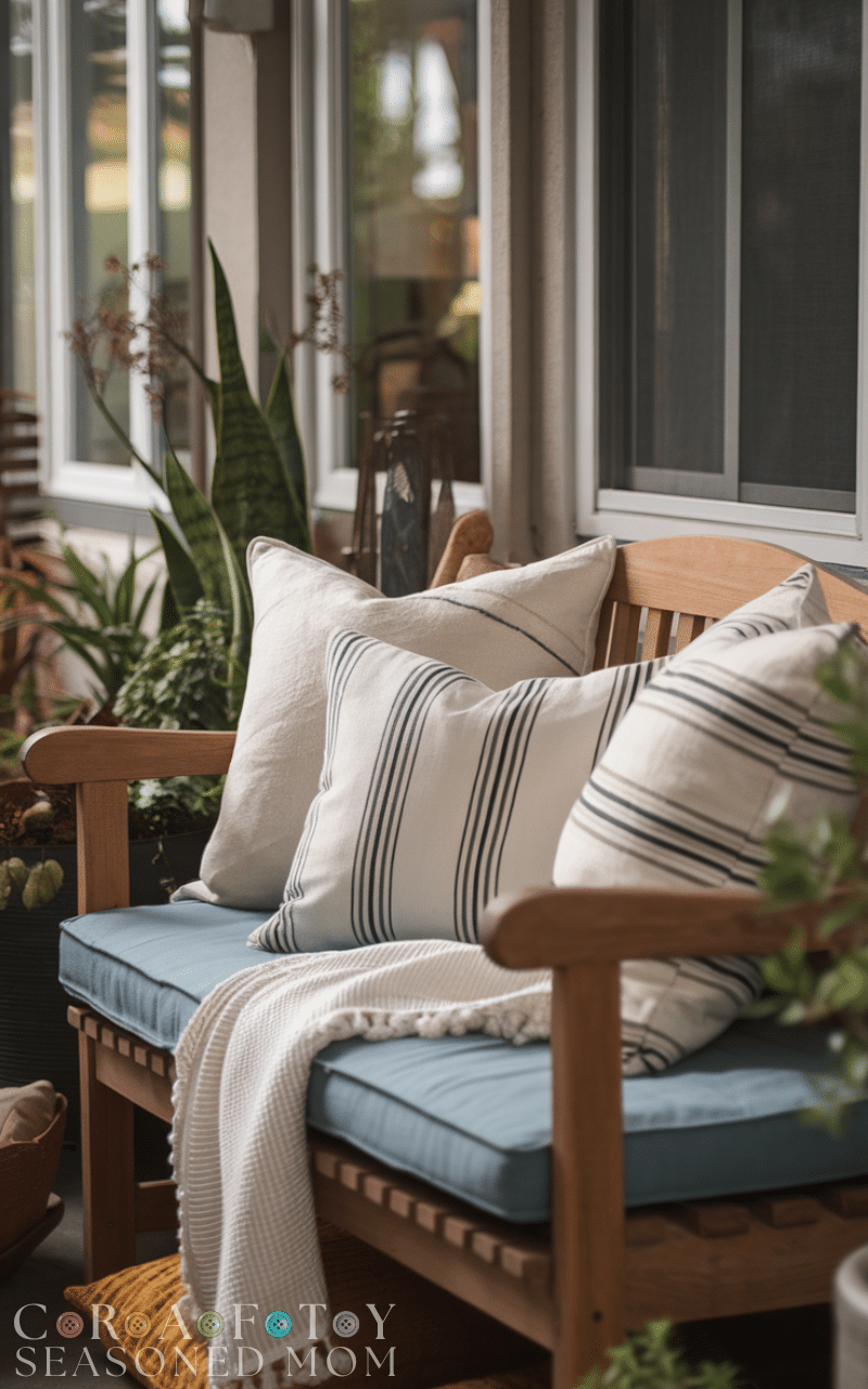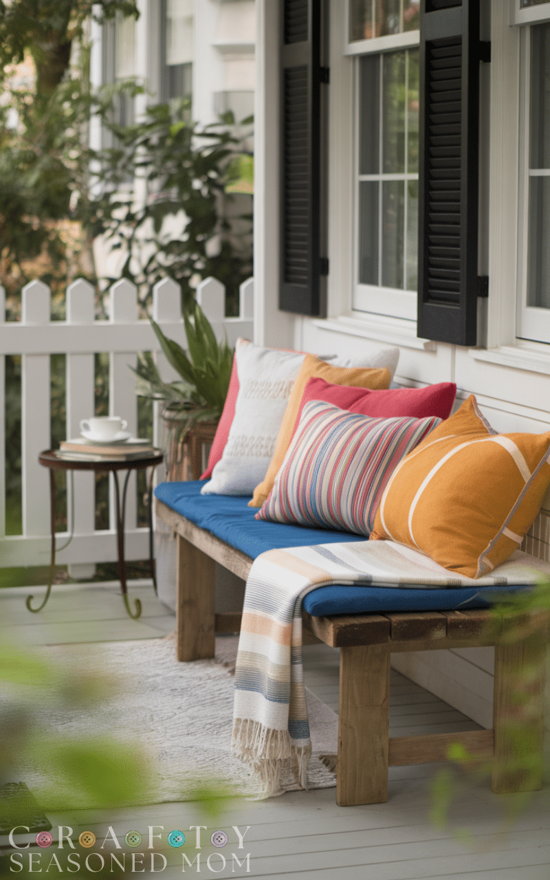 Textiles can completely change the look and feel of your small front porch. Add cushions in various fabrics like cotton and linen and layer them with soft throws for a cozy effect. This small front porch idea creates warmth and makes your seating area look stylish and comfortable. Choose light colors in summer and deeper tones in winter to match the seasons and refresh your decor without much effort.