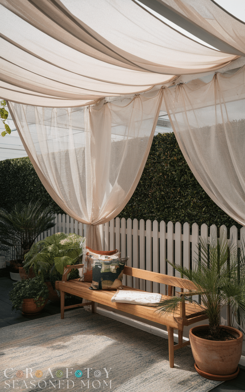 Outdoor curtains bring elegance and comfort to your porch. Choose light flowing fabrics that move gently with the breeze for a cozy and relaxing vibe. This small front porch idea adds shade and privacy while turning your space into a mini retreat. You can tie the curtains during the day and close them in the evening for a peaceful atmosphere that feels like an outdoor living room.