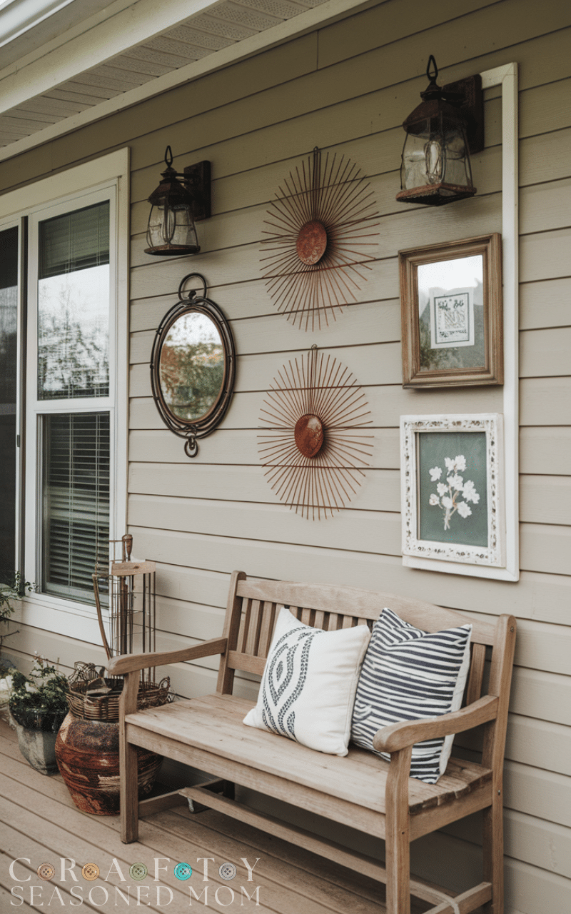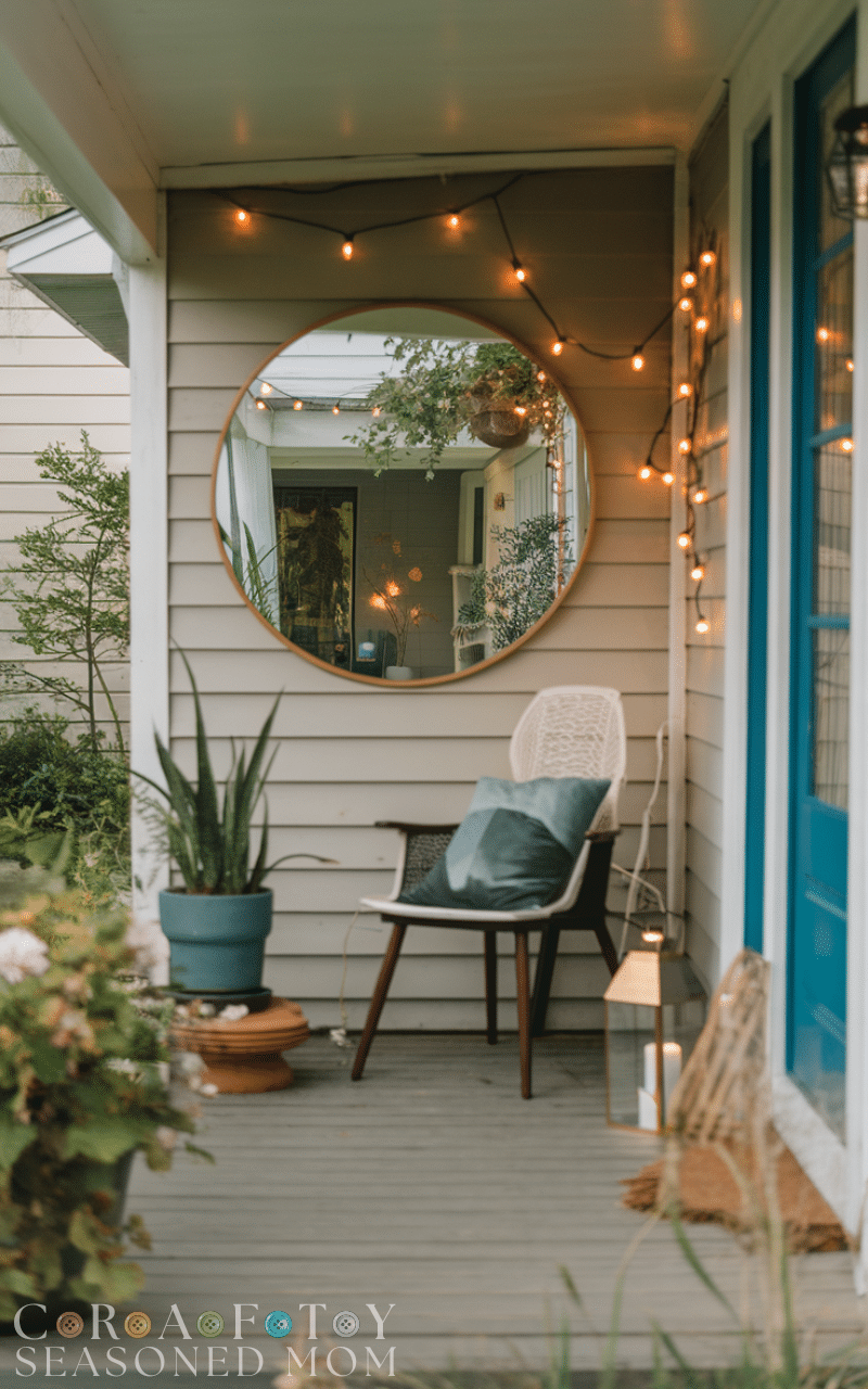A mirror can work wonders for a small space. Place an outdoor-safe mirror on one wall to reflect light and make your porch appear larger. This small front porch idea adds brightness and a touch of sophistication while enhancing the overall look. The reflection of plants and lights also creates a magical atmosphere that feels spacious and inviting. It is a clever trick that makes your tiny area feel open and airy.