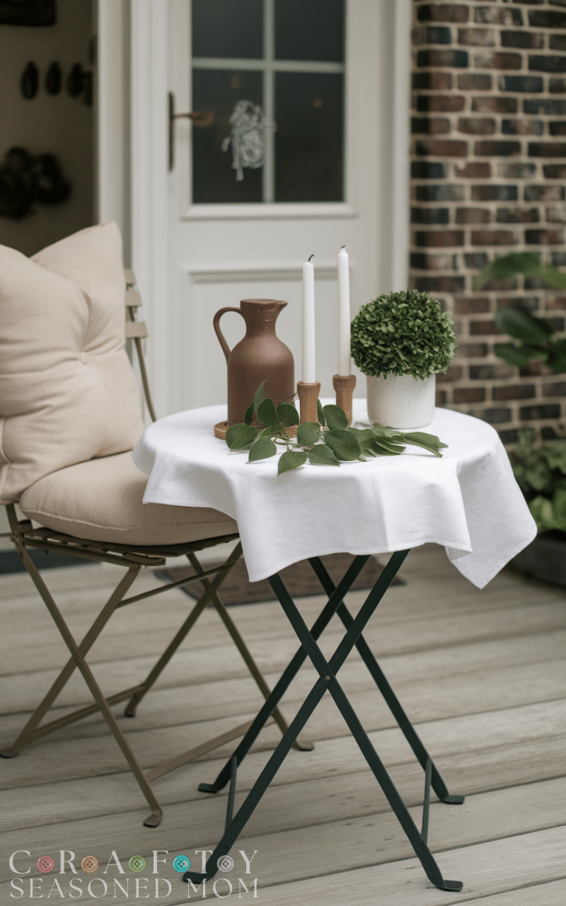 A small table can make your porch more functional and cozy. Choose a foldable bistro table or a small round one to fit your space perfectly. This small front porch idea gives you a surface for morning coffee evening tea or small decorative items like candles and plants. It turns your porch into a mini outdoor living room where you can relax comfortably and enjoy simple everyday moments.